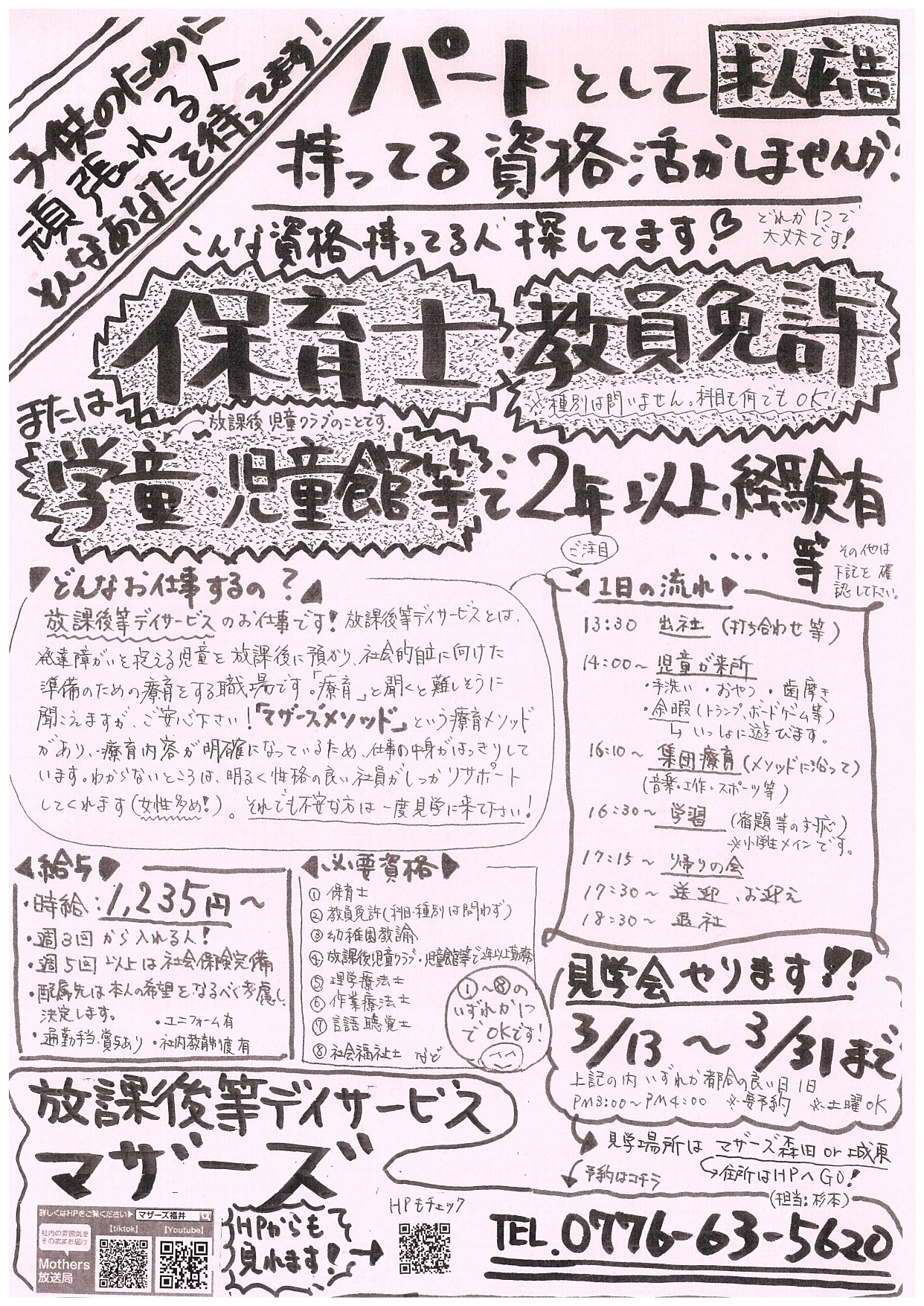 放課後等デイサービスのお仕事です!放課後等デイサービスとは、発達障がいを抱える児童を預かり、社会的自立に向けた準備のための療育をする職場です。「療育」と聞くと難しそうに聞こえますが、ご安心下さい!「マザーズメソッド」という療育メソッドがあり、療育内容が明確になっているため、仕事の中身がはっきりしています。わからないところは明るく性格の良い社員がしっかりサポートしてくれます(女性多め)。それでも不安な方は一度見学にお越しください!(下記番号より申込)