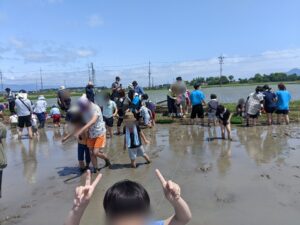素足で田んぼに入る気持ちよさと農作業の大変さを、みんな泥んこになりながら、体感しました。