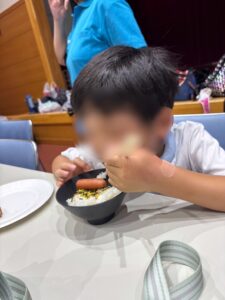 昼食では、ゆりかご水田でできた新米(コシヒカリ)を試食しました。ふっくら艶のある新米を食べると「おいしい!」「ふわふわしてる!」と嬉しそうな子ども達。いつもは少食な子も、お代わりをするぐらい美味しいお米にでき上がっていました。