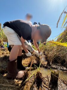先週、台風15号が近畿に上陸・通過し、稲刈りができるか心配でした。当日を迎えると、田植えの時とは真逆の天気で、本当に台風が来たのかと思うほどの青空。少し田んぼの中が雨で滑っていたので長靴を履き、暑い日差しが降り注ぐ中で汗を流しながら新米の稲刈りをしました。鎌の使い方に気を付けながら慎重に稲を刈り、稲の束3~4本の稲藁を使って束の根本部分をぐるっと1周させて、ねじって締めて固定をしていきます。固定できたら身長ぐらいある長い立派な稲の束を持って行き、稲架掛けに掛けて、一連の作業が終了。これを何度も繰り返していきました。