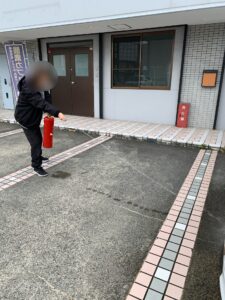 地域の消防署にもご協力いただき、水消火器を使った消火訓練と、実際に事業所内で火災が起こったとの想定での通報訓練を行いました。